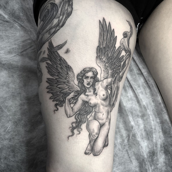 Tattooing since 2010, Eddy has developed a distinctive style specialising in Illustrative and Blackwork tattooing. Her work features intricate botanicals, animalia, mythological creatures, occult symbolism, and cross-hatched portraits. Influenced by 15th-17th century printmaking, as well as fantasy and alchemical imagery, her inspirations include Gustave Doré, Norman Lindsay, and Surrealists like Remedios Varo and Leonora Carrington. She also enjoys creating pop-culture-inspired tattoos such as fantasy and sci-fi literature, cartoons and K-Pop characters.